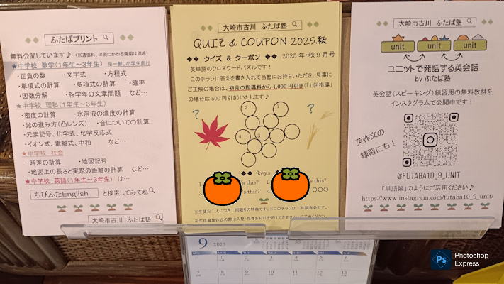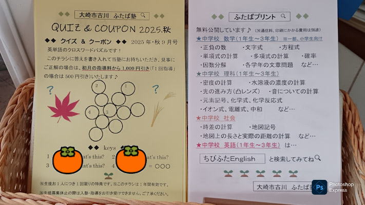 【チラシを置かせていただいている場所】 ・加美町宮崎 門眞菓子店さん ・大崎市古川台町 Loogyさん ・大崎市古川荒谷 Sawaさん 現在は 2025年・秋9月号のクーポンを配布しています! クイズの答えを書き入れて当塾にお持ちいただき、見事にご正解の場合は、初月の指導料から1,000円引き(「1回指導」の場合は500円引き)いたします♪(^o^)/