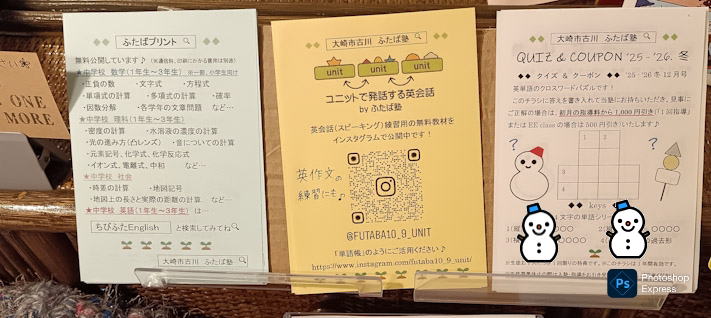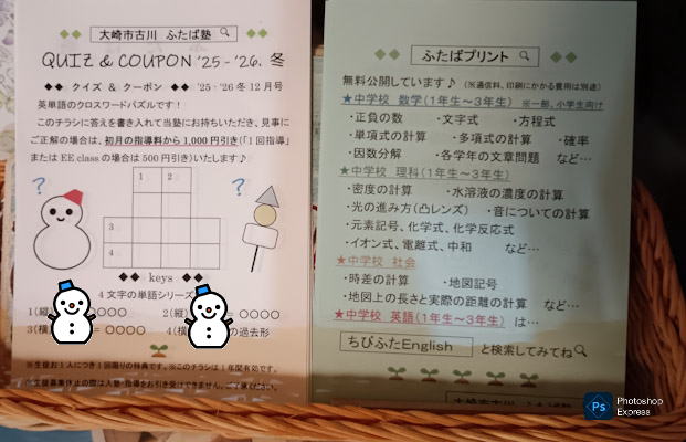 【チラシを置かせていただいている場所】 ・加美町宮崎 門眞菓子店さん ・大崎市古川台町 Loogyさん ・大崎市古川荒谷 Sawaさん 現在は 2025-2026年・冬12月号のクーポンを配布しています! クイズの答えを書き入れて当塾にお持ちいただき、見事にご正解の場合は、初月の指導料から1,000円引き(「1回指導」「EE class」の場合は500円引き)いたします♪(^o^)/